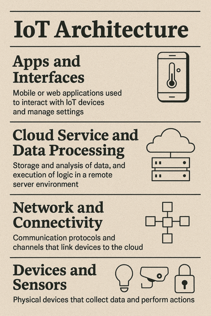 A layered IoT model. Classic IoT architecture is often shown as layers, each with a clear role. Key parts are below.